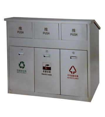 • 產品材質:三分類不銹鋼垃圾箱采用201#,202#,304#優質不銹鋼材料模壓成型,堅固耐用,不易破損;耐火安全,抗高低溫,適合各種惡劣氣候條件;金屬亮澤 ,高雅美觀,廣泛適用于各種場所;內外表面光潔,減少垃圾殘留,易于清潔;配置鍍鋅板內桶,便于垃圾清倒;