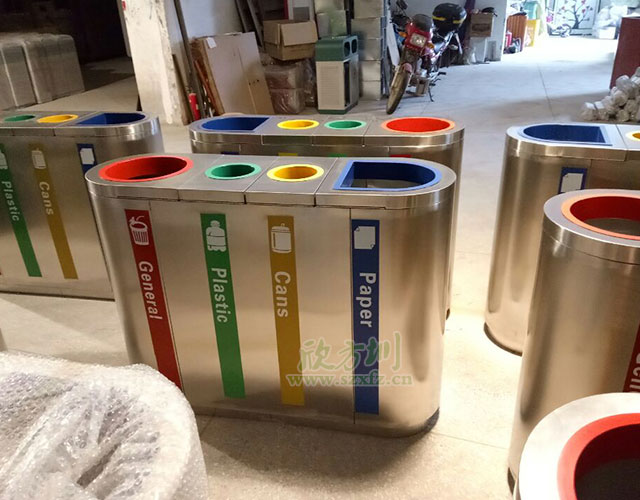 • 產品材質:欣方圳商場精品不銹鋼四分類垃圾桶采用新型的剪鈑下料,折彎、沖壓、焊接、打磨、等工藝: 表面經過除油、噴砂防銹處理后,再進行酸洗磷化處理;表面清理干燥后整體進行靜電噴涂,涂層厚度達到 90um,經過流水線高溫固化爐固化后再出爐冷卻,加工后的塑粉附著力強,不易剝落;
