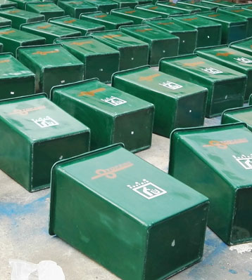 玻璃鋼無蓋垃圾桶是為廣東通驛高速公路服務區生產的一款桶,通過手糊工藝涂刷采用玻璃纖維和樹脂復合而成,經過打磨、修復、噴漆等工藝成型。