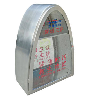深圳應急、深圳三防水域邊防汛應急救援物資柜,采用304啞光拉絲加厚不銹鋼材質焊接成型,5MM鋼化玻璃柜門,按跳門鎖開啟設計。