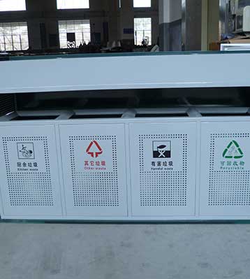江西南昌園林綠化工程公司在室外分類垃圾桶的選擇上,采購的是當下流行的可回收物、其他垃圾、廚余垃圾、有害垃圾組成的4分法垃圾收集容器。鍍鋅板...